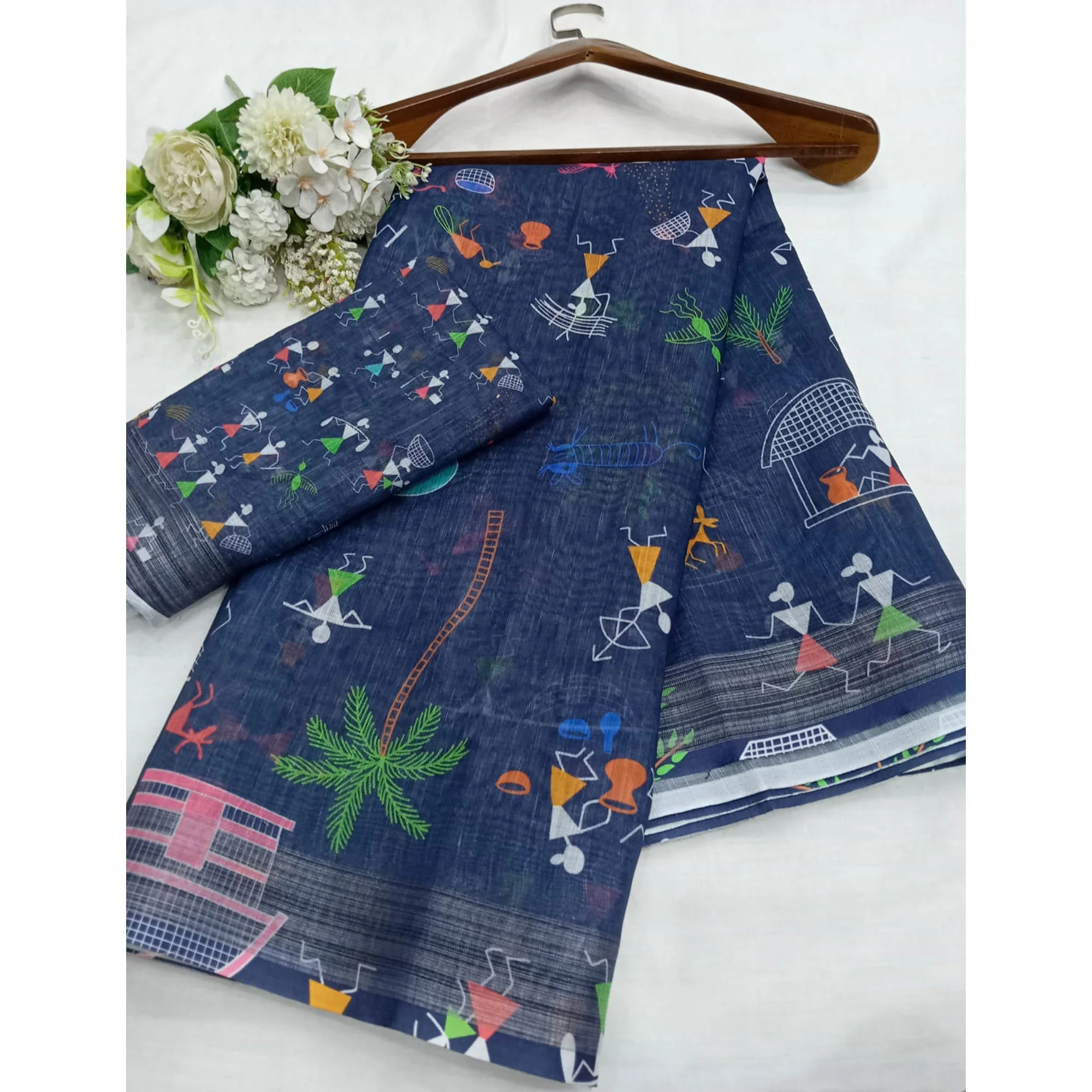 Blue colored saree is made from linen fabric which is highlighted with digital print as shown. Comes along with unstitched linen cotton blouse piece which you can customise as per your design/style. Occasion - You can wear this saree for casual and others.Â