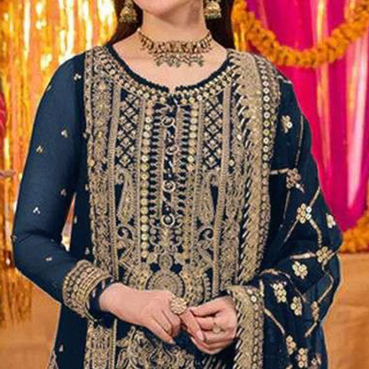 Blue colored Pakistani suit is prettified with Embroidery work and Sequence Work as shown which makes it appear classy. This top is made of Georgette fabric which is accompanied with Santoon bottom and Georgette dupatta. Women can buy this suit to wear for their parties and festivals.Â