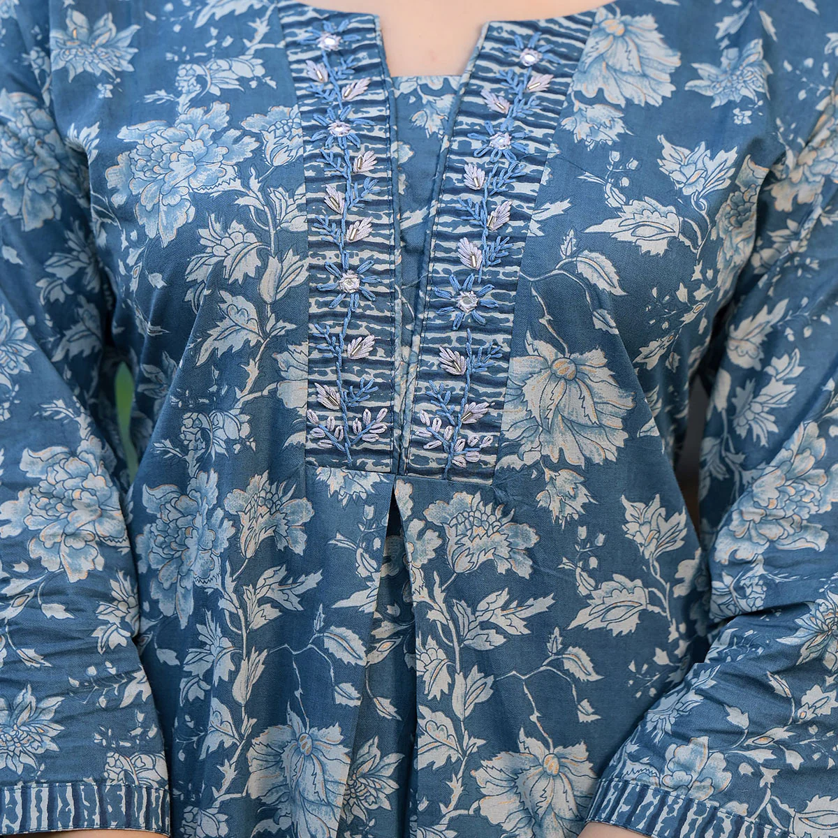Blue Floral Printed With Katha Work Pure Cotton Straight Salwar Suit