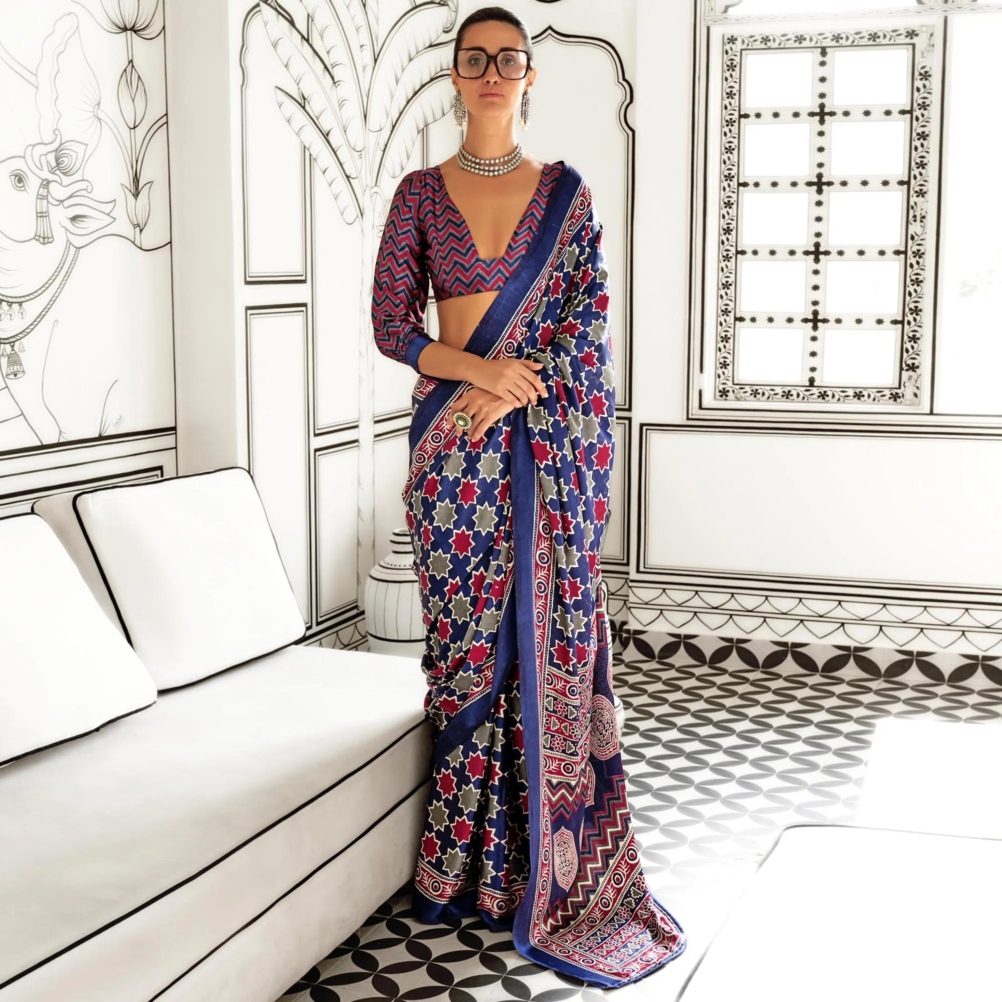 Blue Printed Crepe Saree