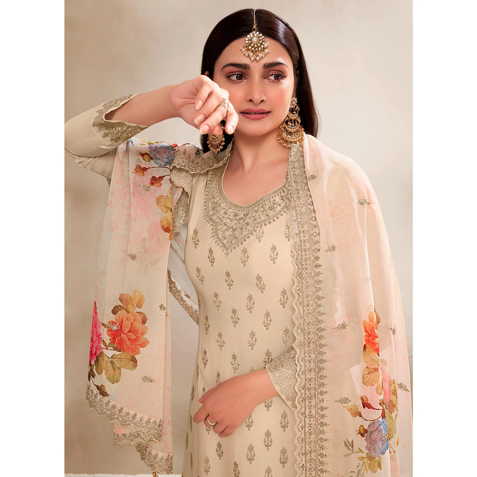 Cream Embroidered Chinon Semi Stitched Dress Material With Palazzo