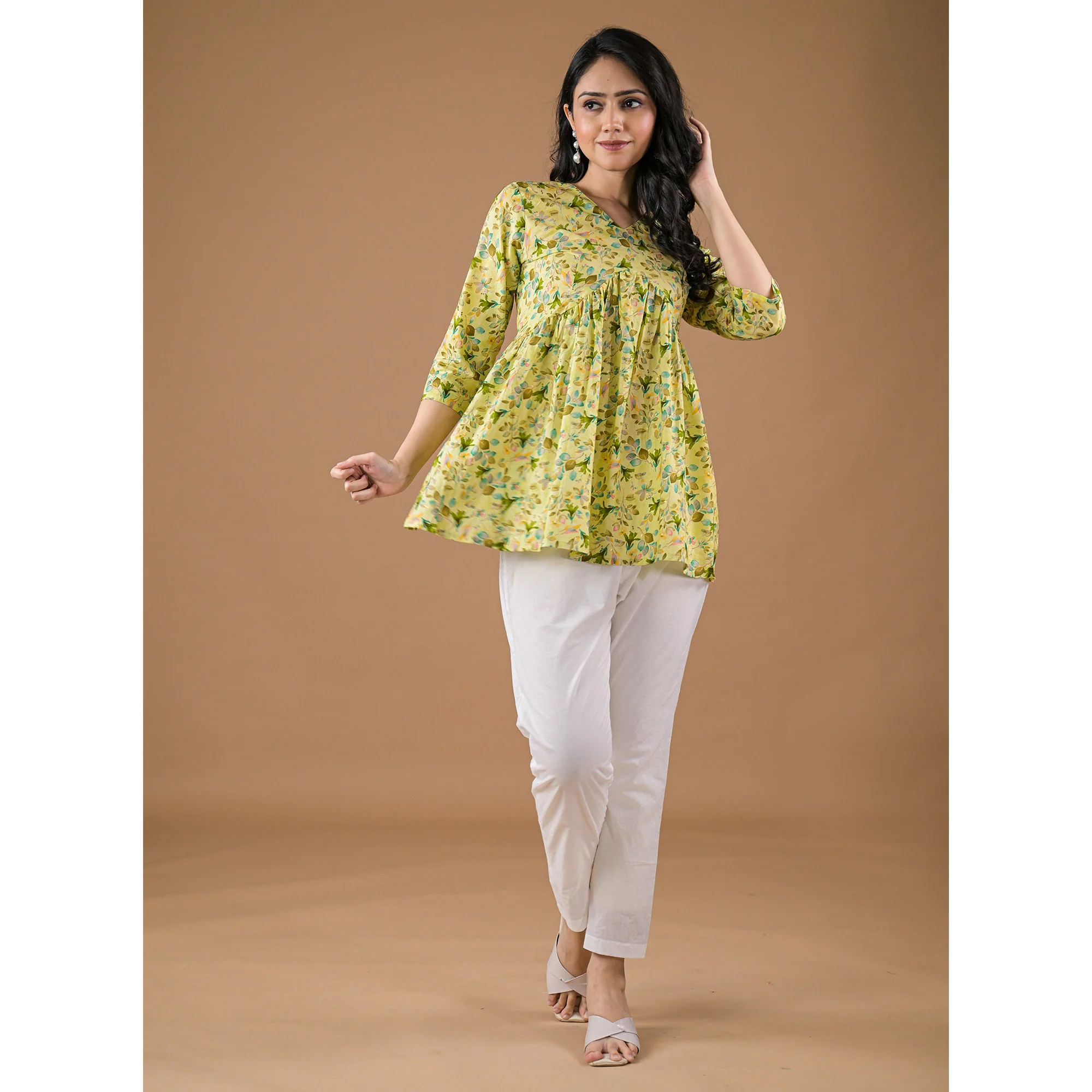 Green colored top is fashioned on pure cotton fabric which is lightweight and assures the wearer a perfect fit & comfort. This stitched top is floral pattern as shown. Ideal for office, casual, outing & weekend get together.Â