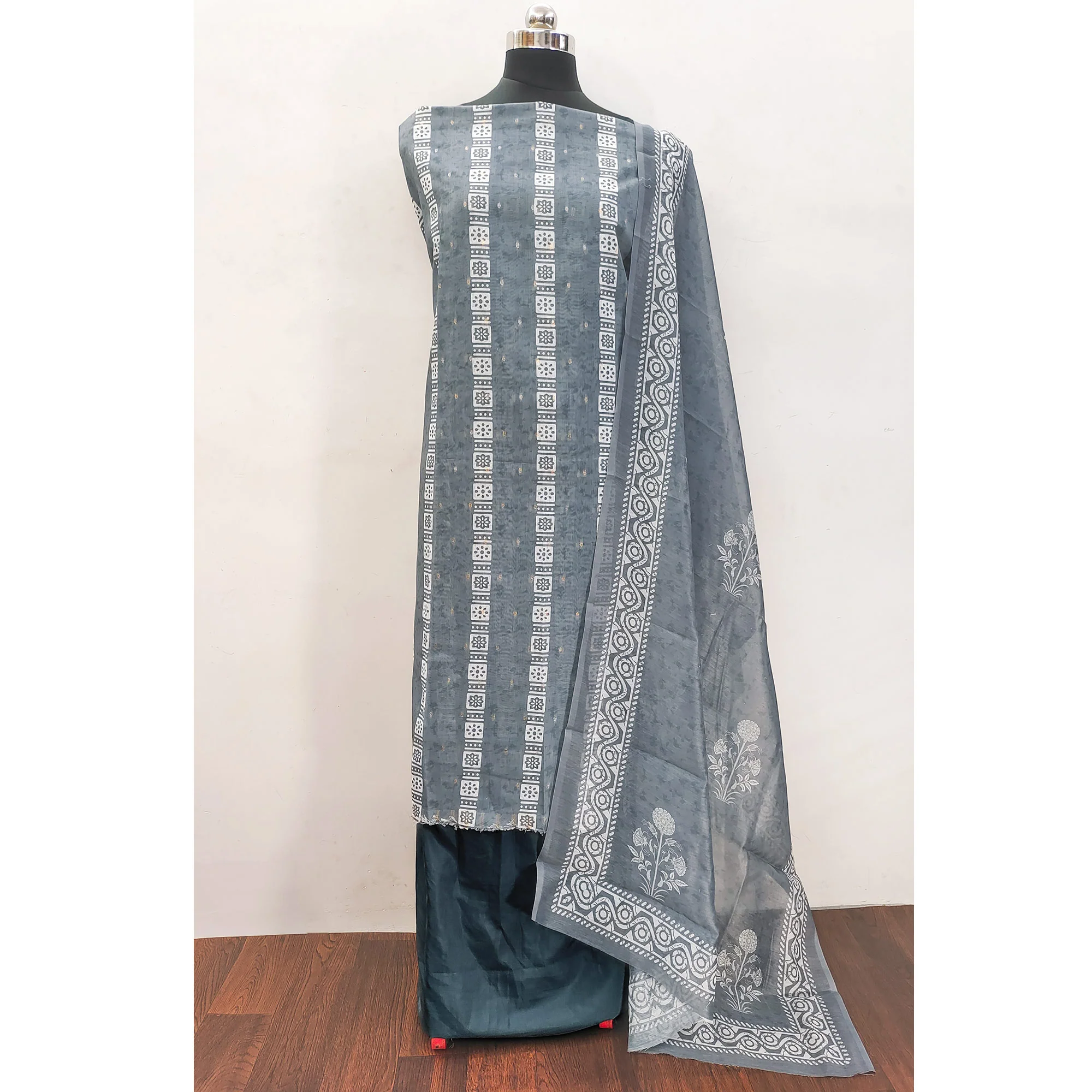 Grey Floral Printed Chanderi Dress Material