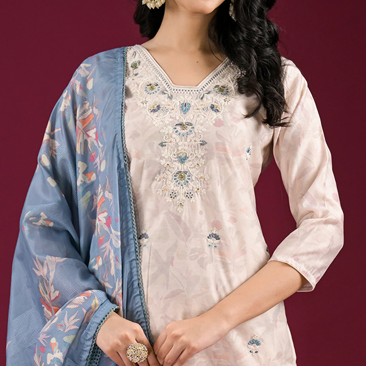 Linen White colored suit is prettified with floral embroidery as shown which makes it appear classy. This top is made of chanderi silk fabric which is accompanied with cotton blend bottom and cotton blend dupatta. Women can buy this suit to wear for their festive and others.Â