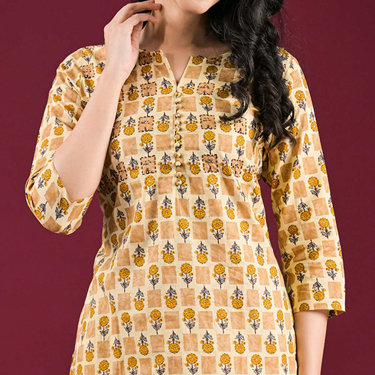 Mustard colored kurti is fashioned on pure cotton fabric which is lightweight and assures the wearer a perfect fit & comfort. This stitched kurti is beautified with floral print and sequins embroidered work as shown. Ideal for office, casual, outing & weekend get together.Â