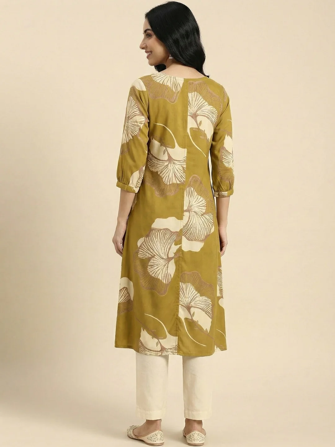 Elevate your everyday style with this charming olive floral printed rayon A-line kurti. This comfortable and chic kurti features a delightful floral print, adding a touch of elegance to your look. The A-line silhouette flatters all body types, while the button-down detail adds a unique and stylish element.