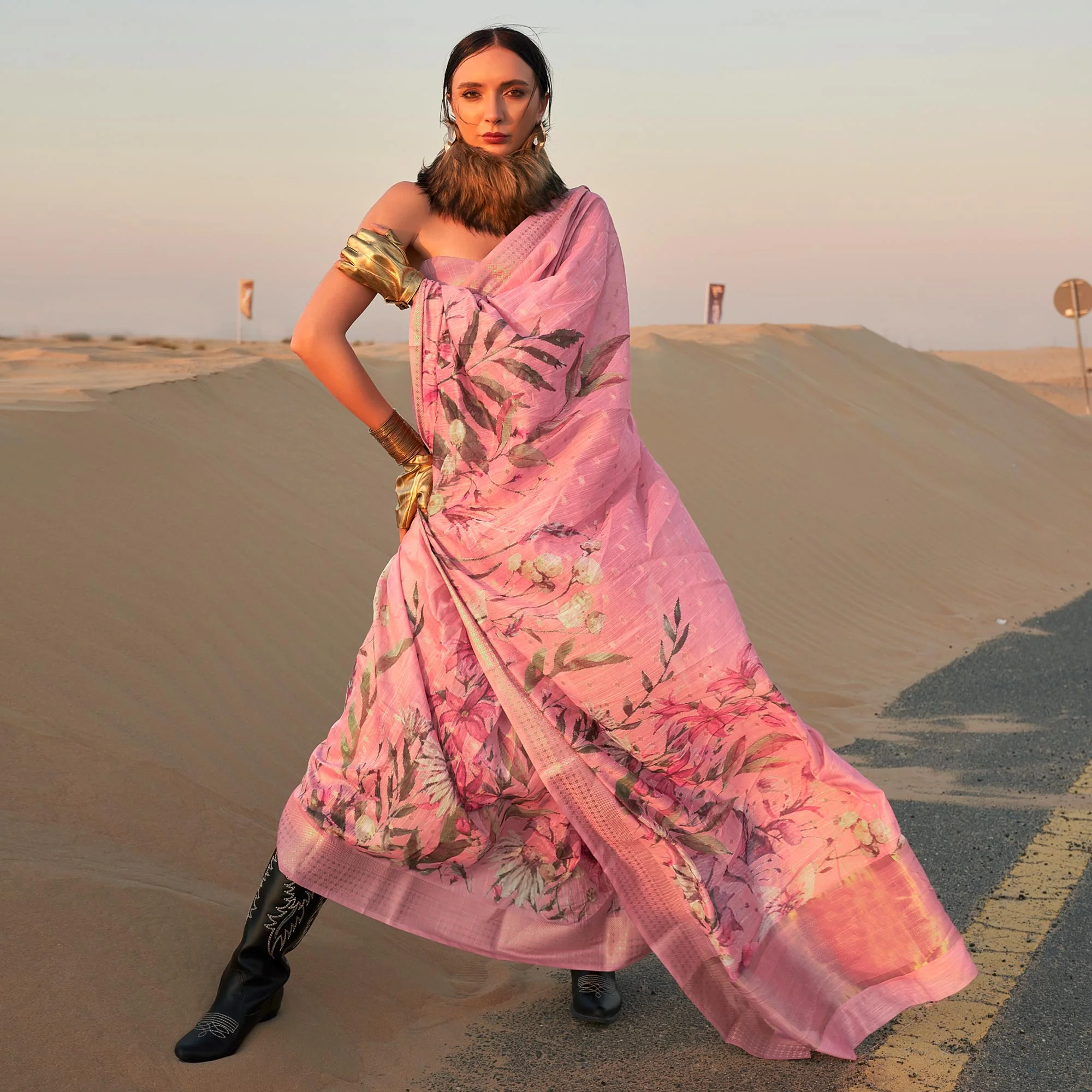 Pink colored saree is made from linen fabric which is highlighted with beautiful digital printed with zari lace border work as shown. comes along unstitched linen blouse piece which you can customise as per your design/style. Occasion - You can wear this saree for festive and functions.Â