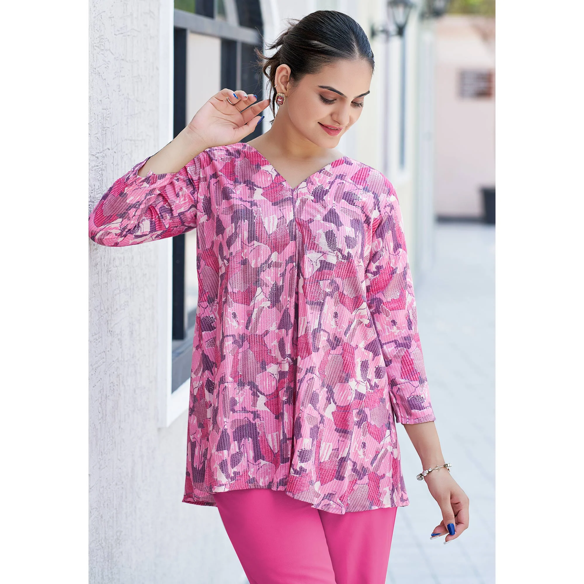 Pink colored top is fashioned on rayon fabric which is lightweight and assures the wearer a perfect fit & comfort. This stitched dress is beautified with printed work as shown. Ideal for casual, outing & get-together.Â