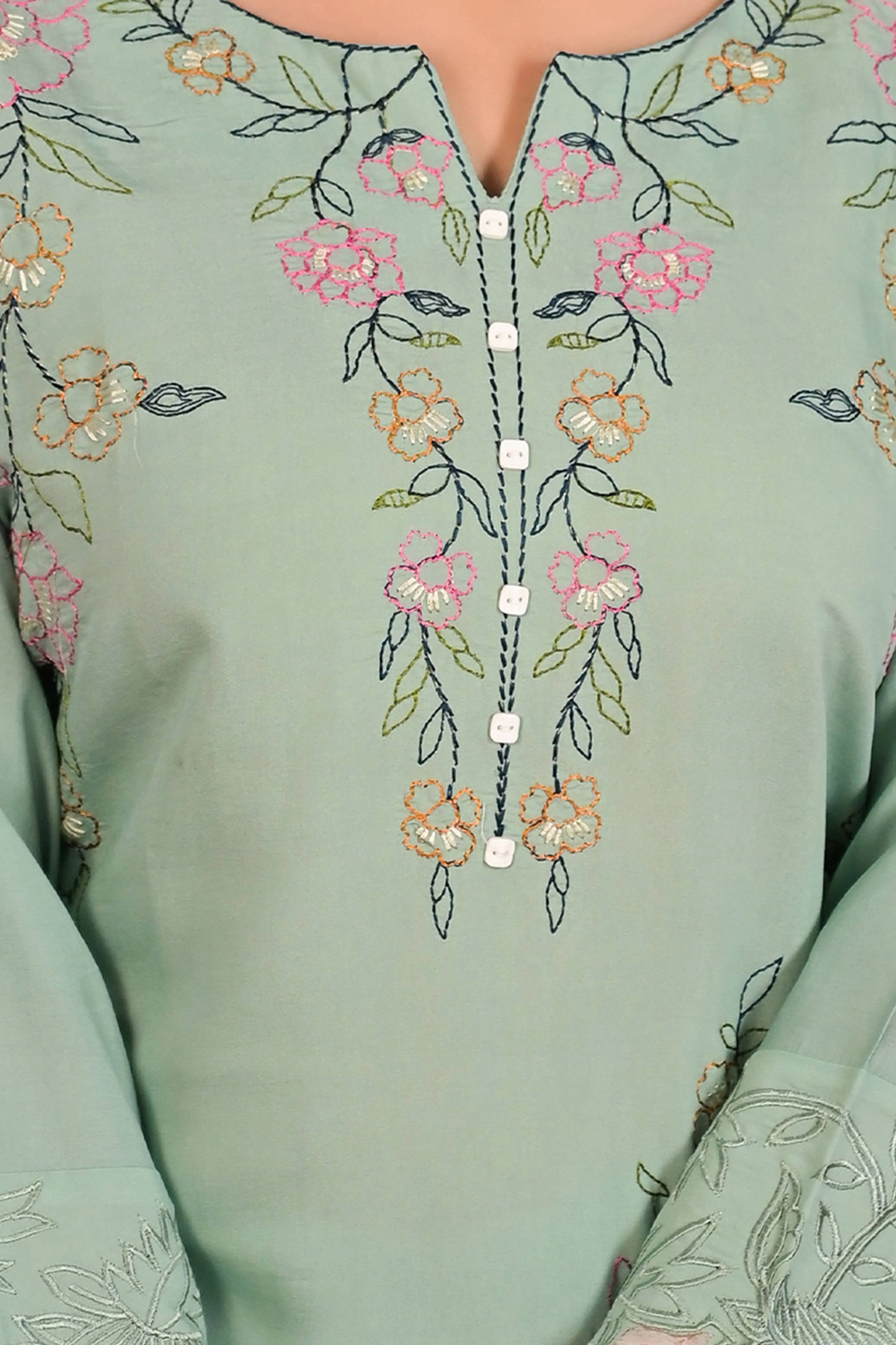 Pista Green Floral Embroidered Chanderi Top Bottom Set