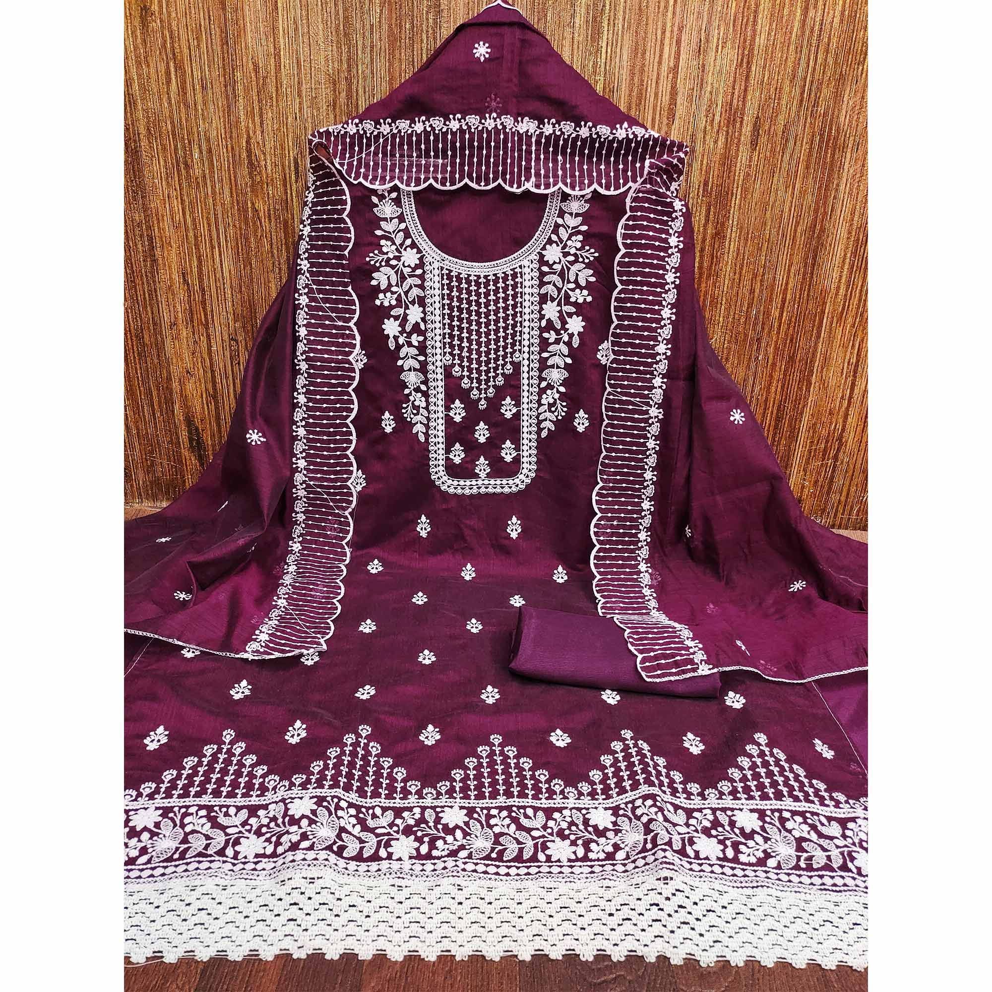 Purple Floral Embroidered Chanderi Dress Material