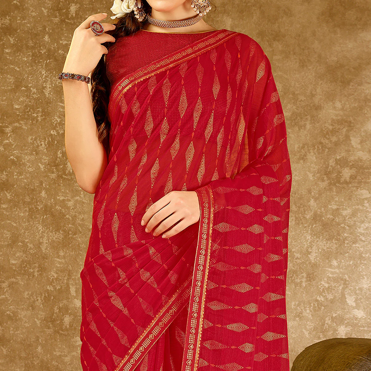 Red Foil Printed Chiffon Saree With Lace Border
