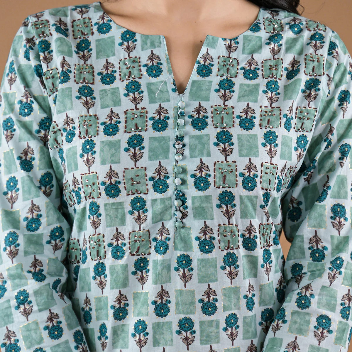 Sea Green colored kurti is fashioned on pure cotton fabric which is lightweight and assures the wearer a perfect fit & comfort. This stitched kurti is beautified with floral print and sequins embroidered work as shown. Ideal for office, casual, outing & weekend get together.Â