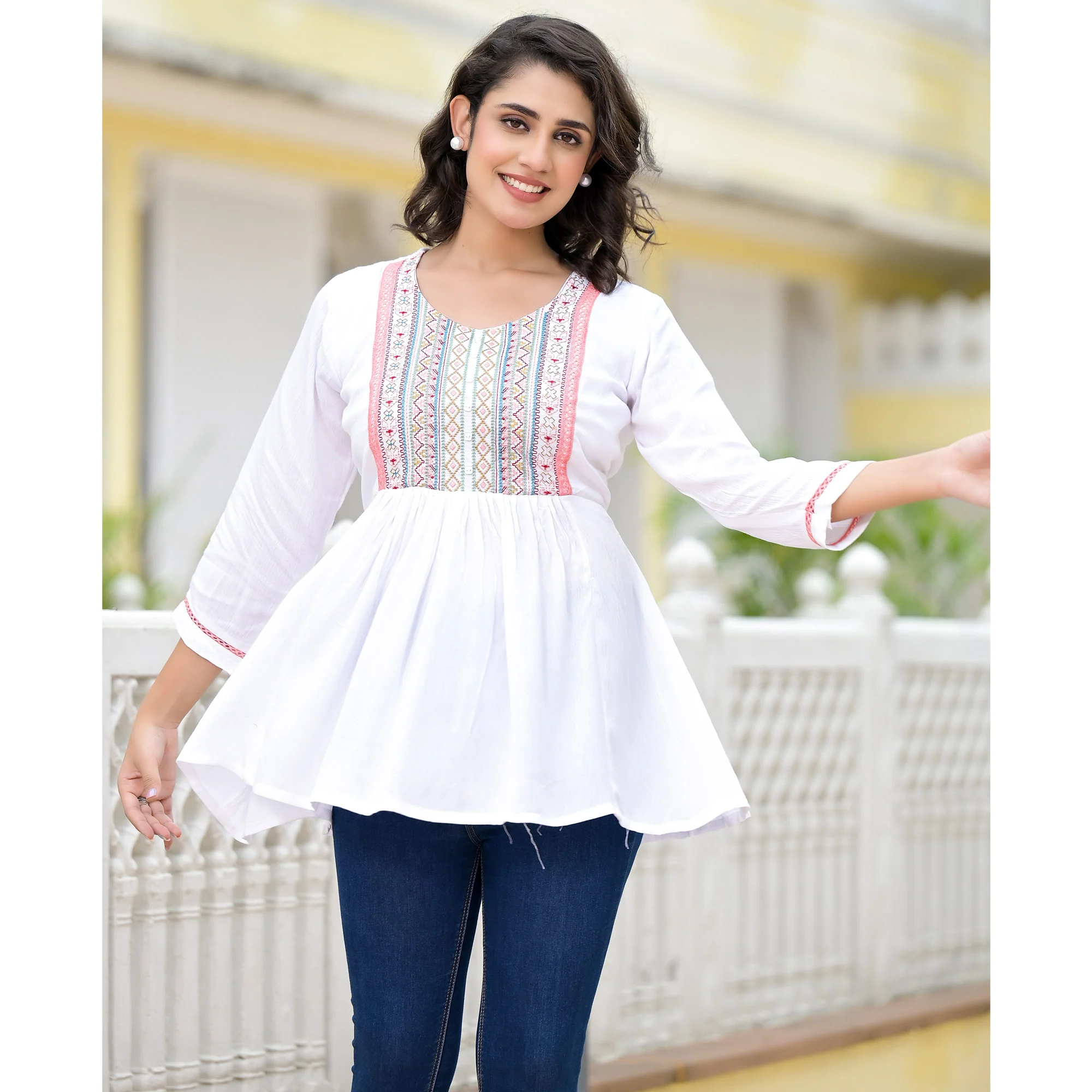 White colored top is fashioned on rayon fabric which is lightweight and assures the wearer a perfect fit & comfort. This stitched top is beautified with floral embroidery on yoke as shown. Ideal for casual and daily, office wear & get together.Â