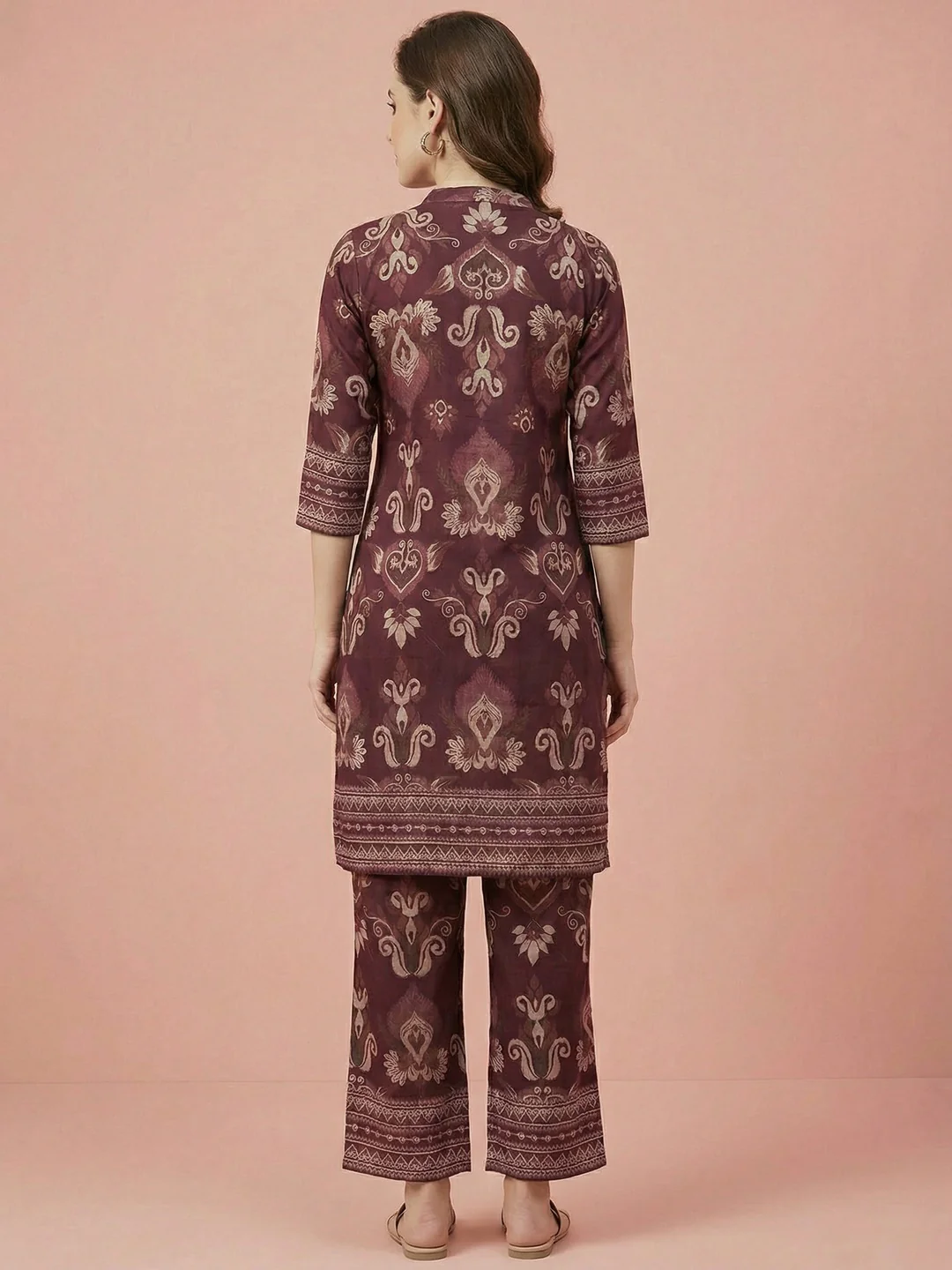 Step out in style with this chic wine viscose top and bottom set. The elegant print adds a touch of sophistication, making it perfect for various occasions. The top features a mandarin collar with delicate detailing down the front, enhancing its unique appeal.