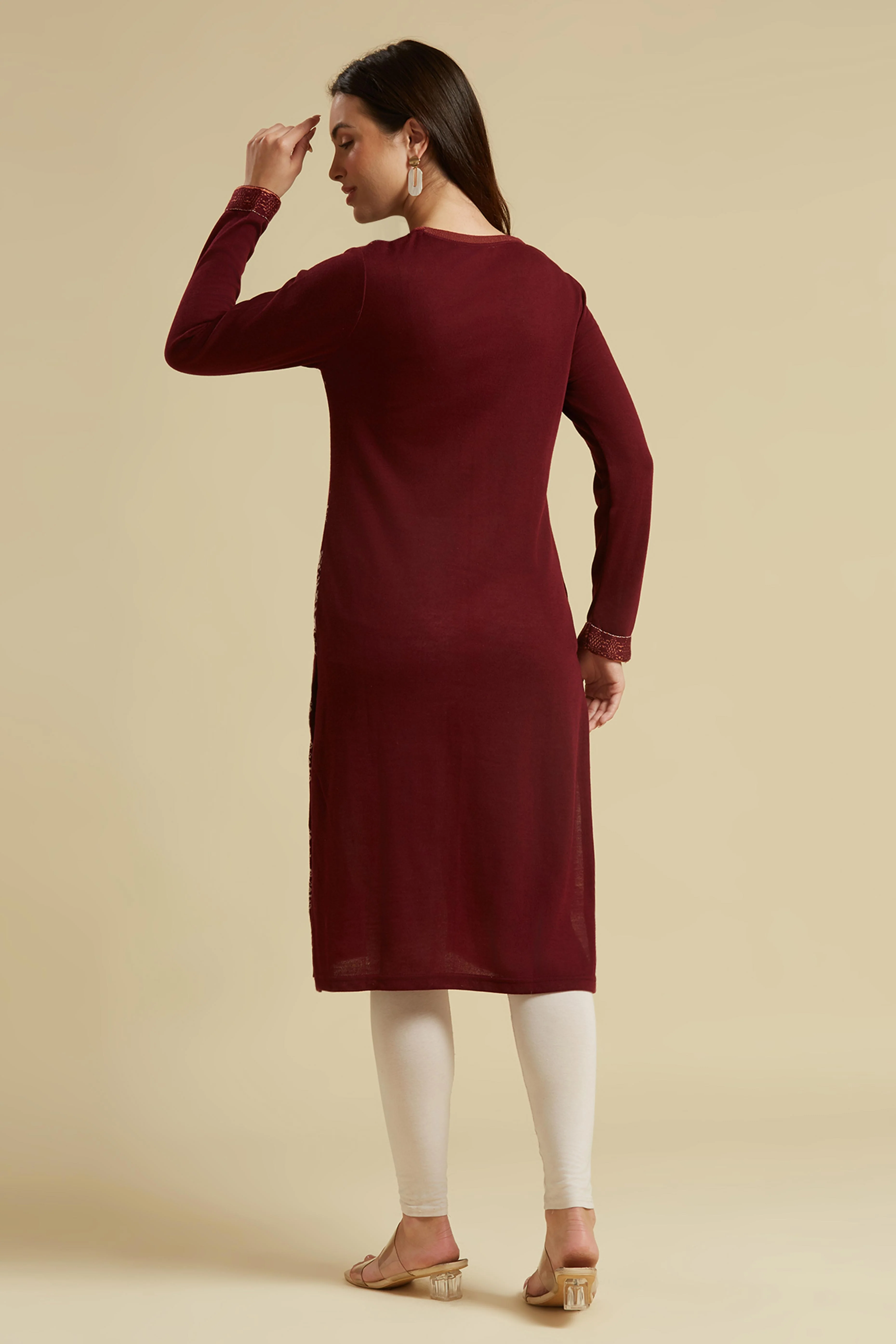 Wine colored kurti is fashioned on woolen fabric which is lightweight and assures the wearer a perfect fit & comfort. This stitched kurti is beautified with floral work on neck as shown. Ideal for casual, office wear and others.Â